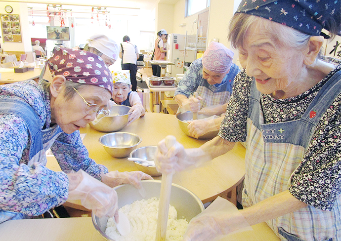 デイサービスでは毎月2回「料理クラブ」を行っています。料理を作る楽しさだけでなく、ご利用者の皆さんそれぞれに‘役割’を持っていただくことで食生活の充実をサポートしています。