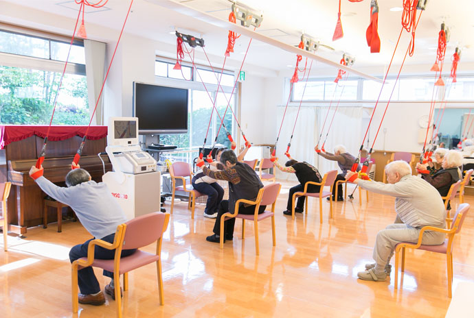朝のごあいさつ~ラジオ体操、入浴、運動プログラム一日の予定や、その他のお知らせを行います。 機械体操、レッドコード、集団体操(ボール体操やセラバンド等)に分かれ、身体を動かしていただきます。